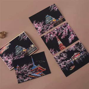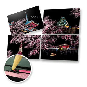 âïž 4 Unique Postcard-Sized Scratch Art Designs â Discover serene Japanese landscapes blanketed in cherry blossoms.