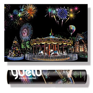 Step into the enchanting world of a fairytale amusement park with this stunning scratch art set. From the elegant carousel to the towering Ferris wheel and dazzling fireworks, this scene captures the wonder, joy, and nostalgia of a magical night under the stars.