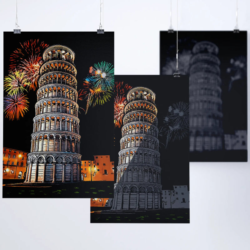 The Bright History 4-in-1 Scratch Art Set features four stunning night scenes inspired by some of the most famous landmarks in European history. As you scratch away the surface, glowing highlights and dramatic colors reveal themselves, transforming each artwork into a radiant masterpiece.