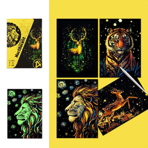 Swipe away the black coating to reveal the radiant stag, the watchful tiger, the majestic lion and the ethereal woodland guardian.