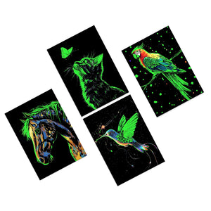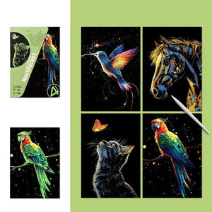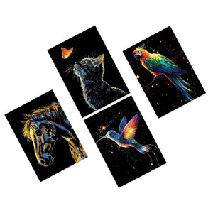 Playfully swipe away the surface and reveal luminous creatures: the curious cat, the elegant horse, the vibrant parrot and the radiant hummingbird.