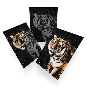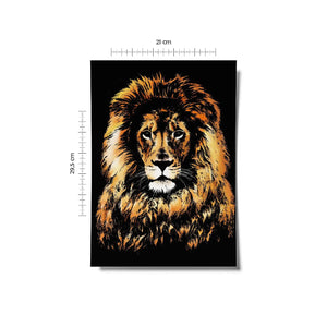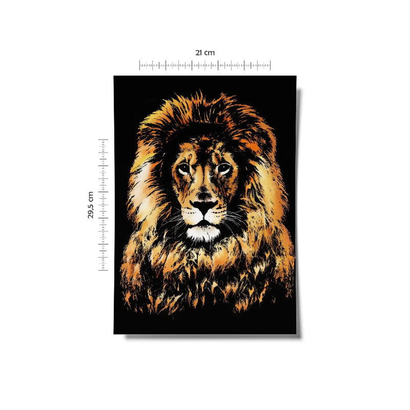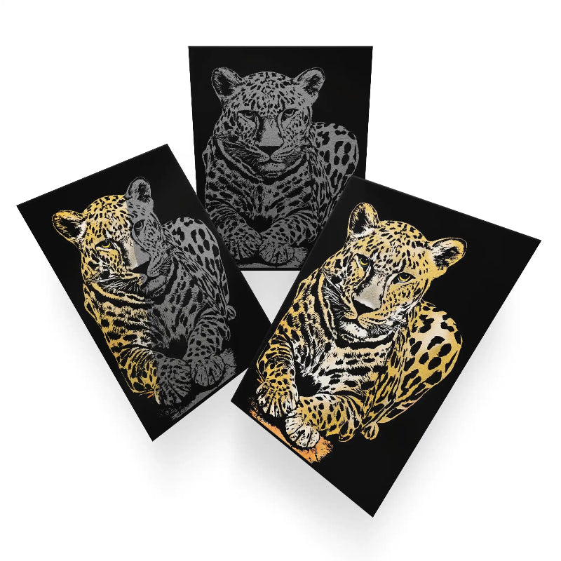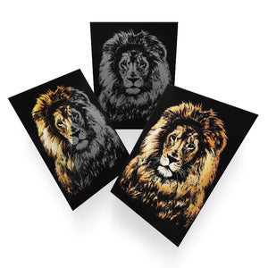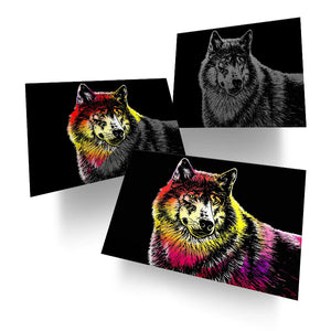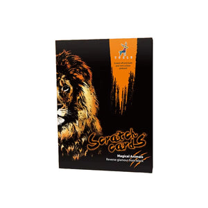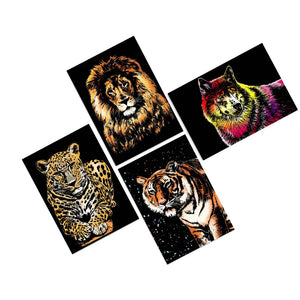 Hidden beneath the black scratch surface lies a stunning array of colors and dramatic details — revealed only as YOU carve out the tiger, leopard, wolf and lion portraits.