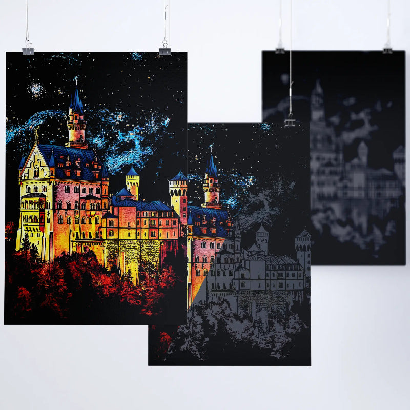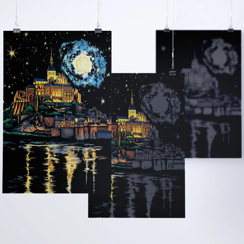 The Scratch Art 4-in-1 Night Edition features four stunning night-themed artworks, each inspired by magical castles and iconic cityscapes from around the world. As you scratch away the top layer, the hidden lights and brilliant colors appear like glowing stars in the night sky.