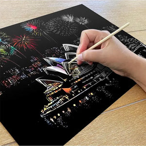 ✔️ Includes a Bamboo Scratch Pen – Perfect for revealing fine architectural lines and shimmering skyline reflections.