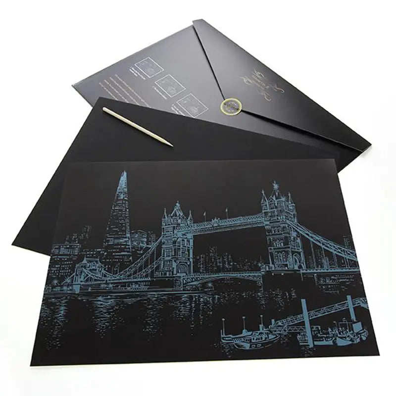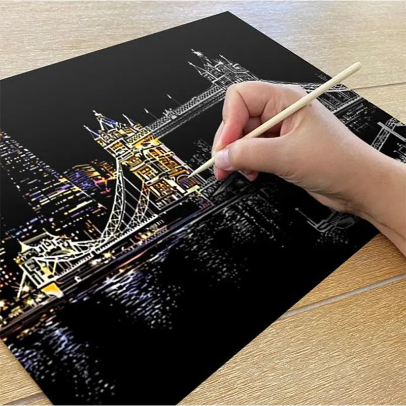 ✔️ Includes a Bamboo Scratch Pen – Ideal for revealing the fine architectural lines and glowing city lights.