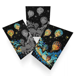 4 phosphorescent scratch art illustrations of magical hot air balloon scenes
