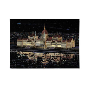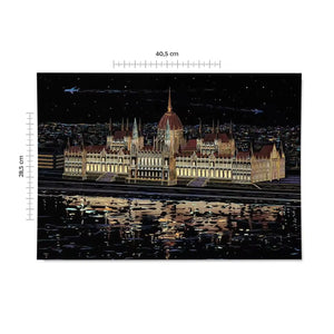 Ünnepeld Budapest építészeti ragyogását ezzel a lenyűgöző KarcMűvészettel! A jeleneten a pompás Országház épülete tündököl aranyló esti fényben, miközben a Duna tükrében visszacsillannak a neogótikus részletek – Európa egyik legismertebb építészeti csodája most a te kezed által kelhet életre.